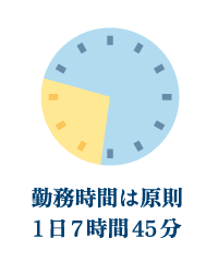●休暇には、年次休暇(年20日(4月1日採用の場合、採用の年は15日)。残日数は20日を限度として翌年に繰越し)のほか、病気休暇、 特別休暇(夏季3日・結婚・出産・忌引・ボランティア等)及び介護休暇があります。