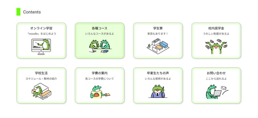 学校のご担当者より「特に〈入学の流れ〉については、いつも問い合わせが殺到する」とお伺いし、図で流れが把握できるように制作したところ、 「おかげでエージェントや学生への説明にも活用できるすばらしいものになりました。口頭で伝えにくい部分について、わかりやすい図を作成していただきありがとうございます。このページを見て、手続き方法を迷う方が減り、安心して入学手続きを行っていただけます。おかげさまで当方の案内の負担も軽減されました。」と、御礼をいただきました。